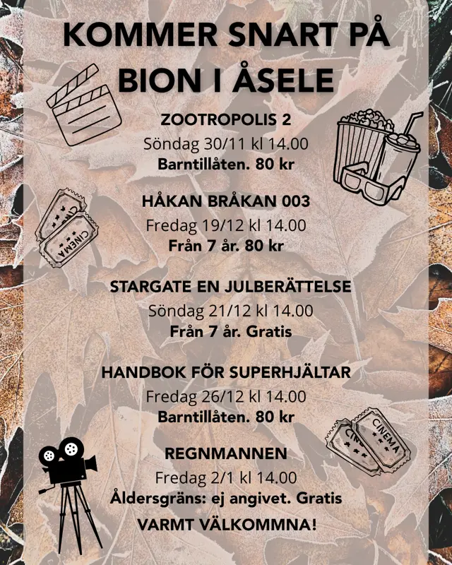 Åseles trevliga biograf finns på Kulturhuset. Åsele kommun har tagit över biografen sedan 2019.