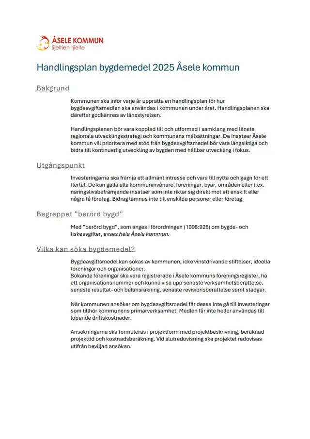 Bygdemedel kan sökas av föreningar i berörd bygd. Berörd bygd definieras i Åsele kommun som hela kommunen. Exempelvis kan hembygdsföreningar, idrottsföreningar och byalag söka bidrag.