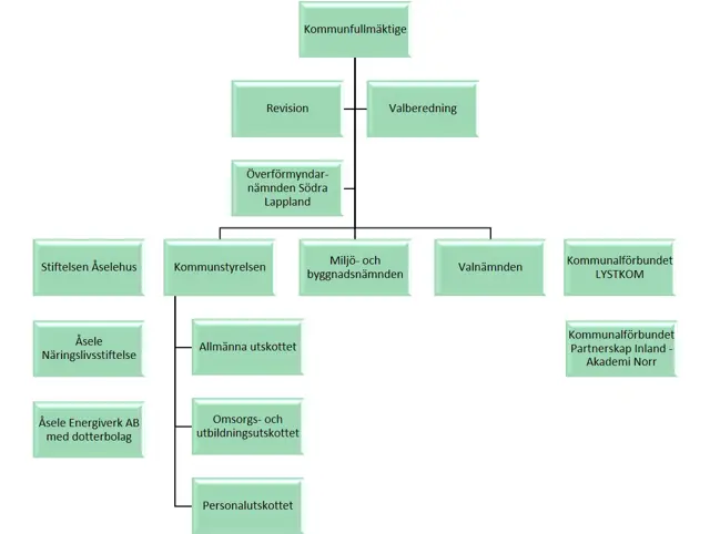 I Åsele är våra verksamheter fördelade på sex olika områden med varsin verksamhetschef. Verksamhetscheferna leds av kommunchefen som har det övergripande ansvaret över kommunens samlade verksamheter.
